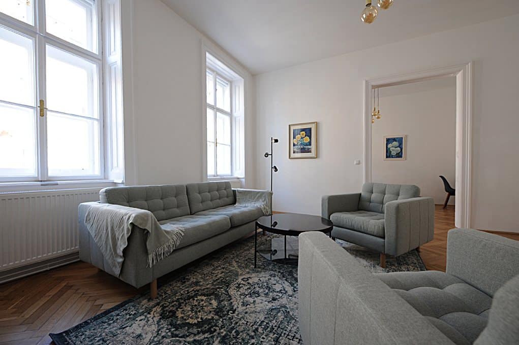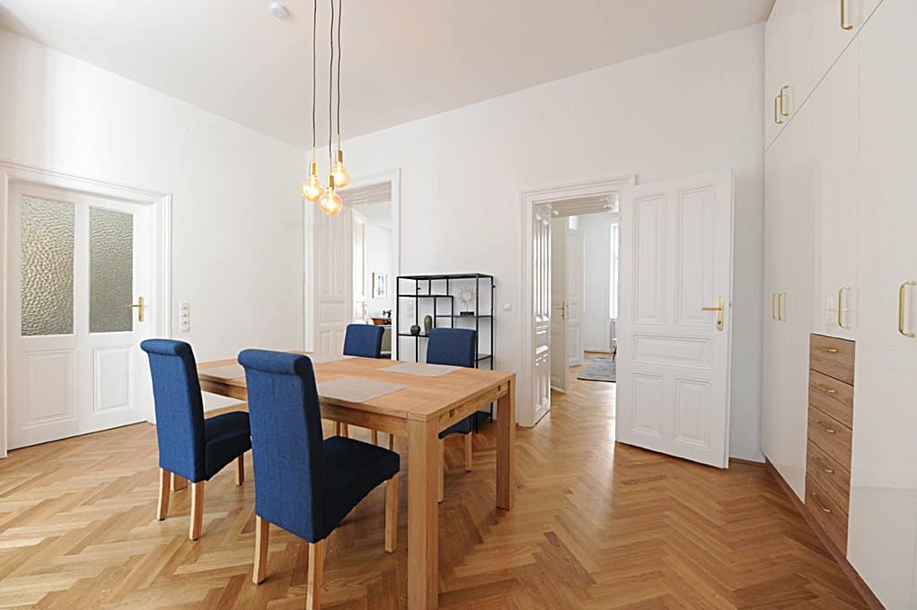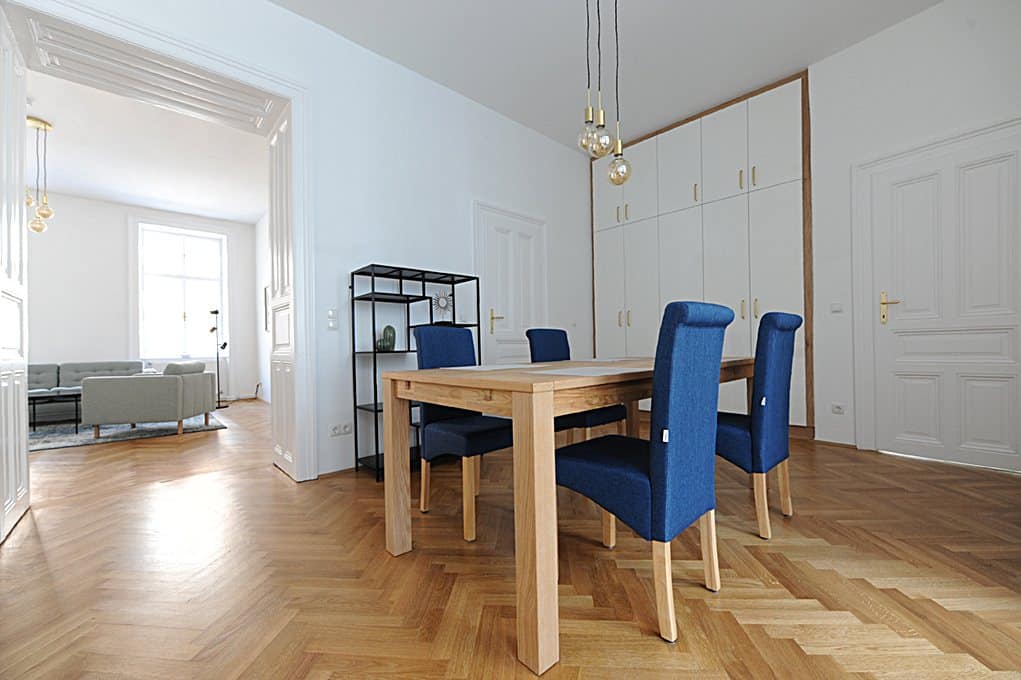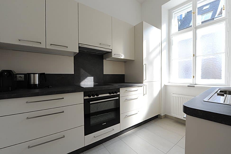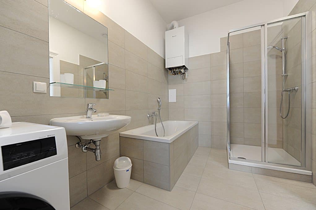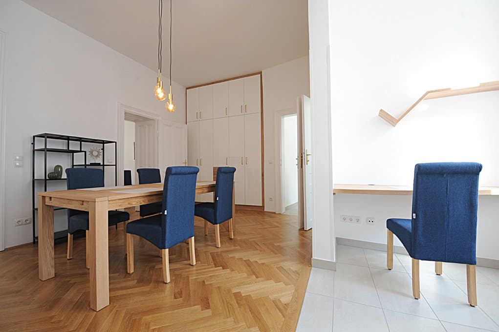 L'appartement moderne et entièrement meublé, d'une superficie de 99 m², comprend 2 chambres, une pièce à vivre, un bureau à la maison, une salle à manger, une cuisine entièrement équipée, une entrée, une salle de bains (baignoire, douche et lave-linge) et un WC.