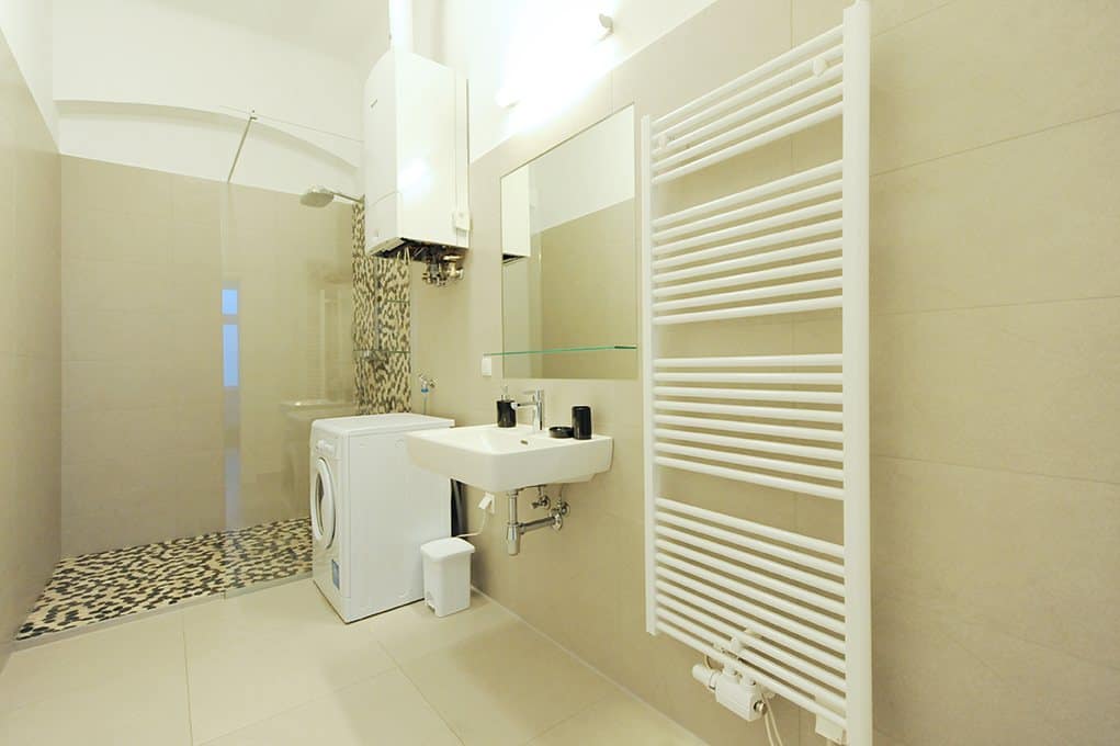 Questo appartamento moderno, completamente ammobiliato e grande 80 m², dispone di una camera da letto, un salotto con cucina completamente attrezzata, un disimpegno, un bagno (con doccia e lavatrice) e un WC.