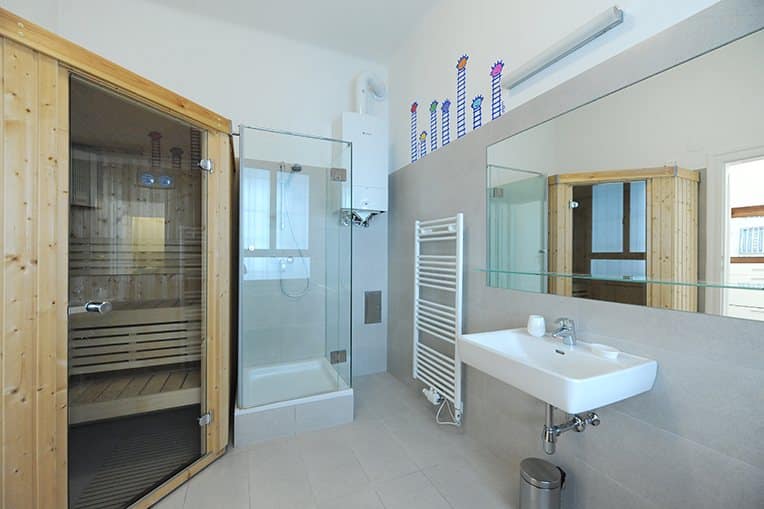 Questo appartamento moderno, completamente ammobiliato e grande 66 m², dispone di una camera da letto spaziosa, una cucina abitabile completamente attrezzata, un disimpegno, un bagno (con doccia e lavatrice) e un WC. La sauna che si trova nell’appartamento soddisfa i più elevati requisiti di relax.